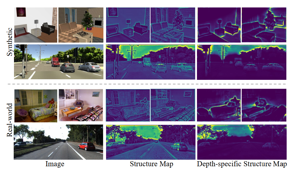 研究员们可视化了学到的通用结构表示和深度特定的结构表示,如图2所示,即使合成数据和真实数据在图像上有明显的不同,学到的结构图和深度特定的结构表示也可以共享很多相似性。