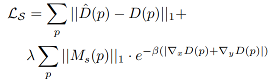 为了训练 STE 模块的解码器,研究员们在其后加了一个深度估计网络,通过对预测的深度施加损失,便可以通过结构图预测出深度图。此外研究员们还用了一个启发性的损失函数,施加在结构图上,以突出结构图中深度相关的区域。如以下公式所示。