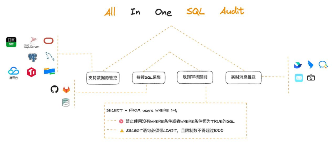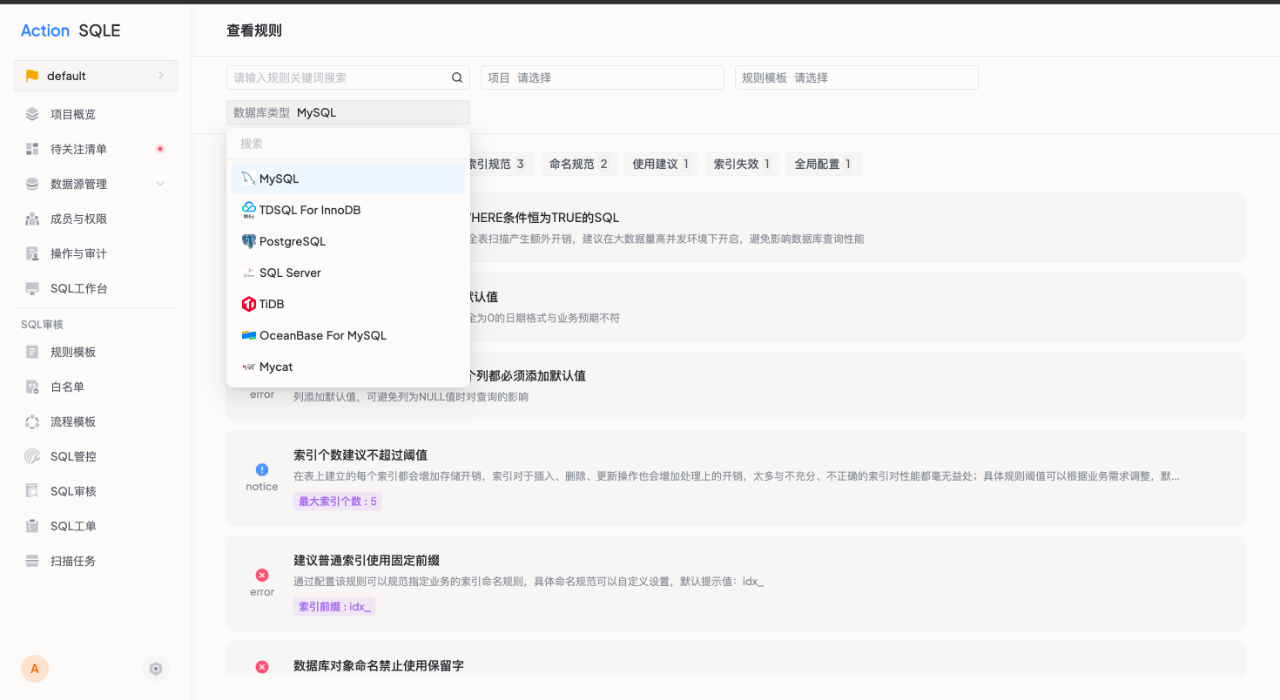 一个支持多种不同类型数据库,覆盖事前控制、事后监督、标准发布场景,帮助您建立质量规范的 SQL 全生命周期质量管理平台。