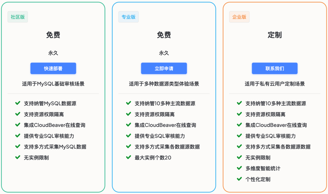 SQLE 专业版 全新上线,如您对 PG、Oracle 等主流数据源类型也有 SQL 质量管理需求,欢迎体验。以下是 SQLE 各版本之间的能力对比概览: