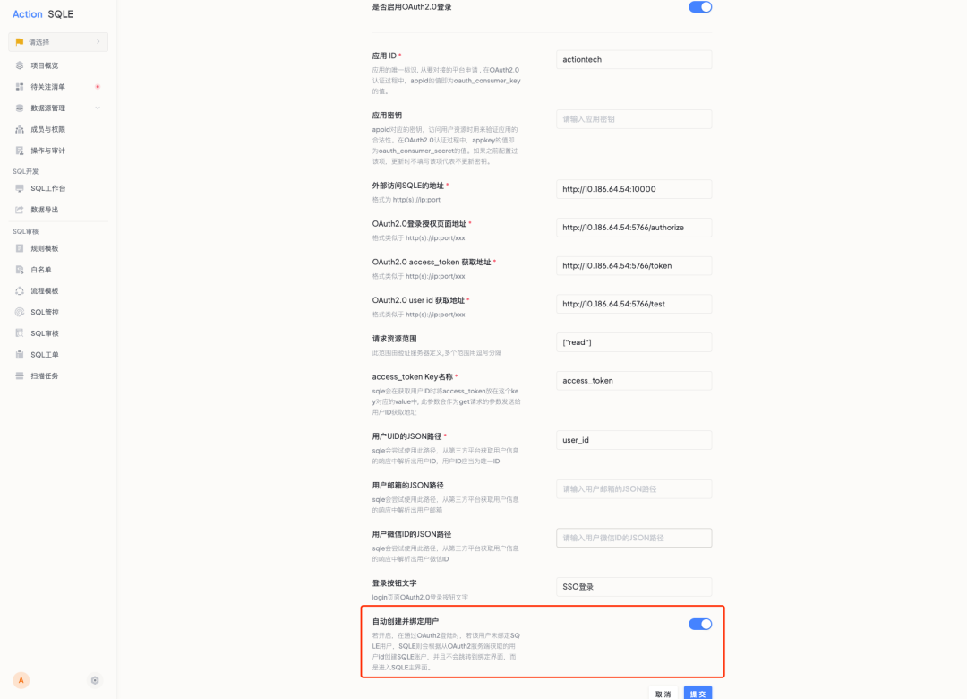 在先前的版本中,如果用户通过 OAuth2.0 登录且未绑定 SQLE 用户,他们需要先绑定才能正常使用系统。在本期更新中,我们添加了一个新功能:自动创建并绑定用户。