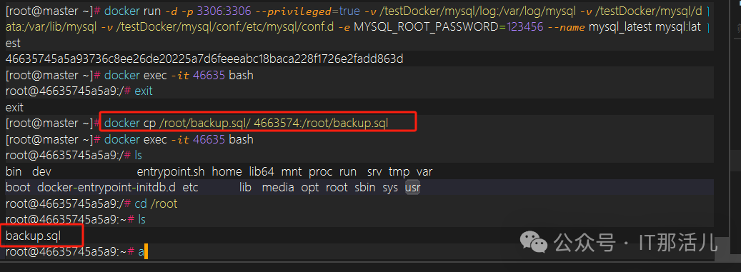 docker cp /root/backup.sql/ 4663574:/root/backup.sql