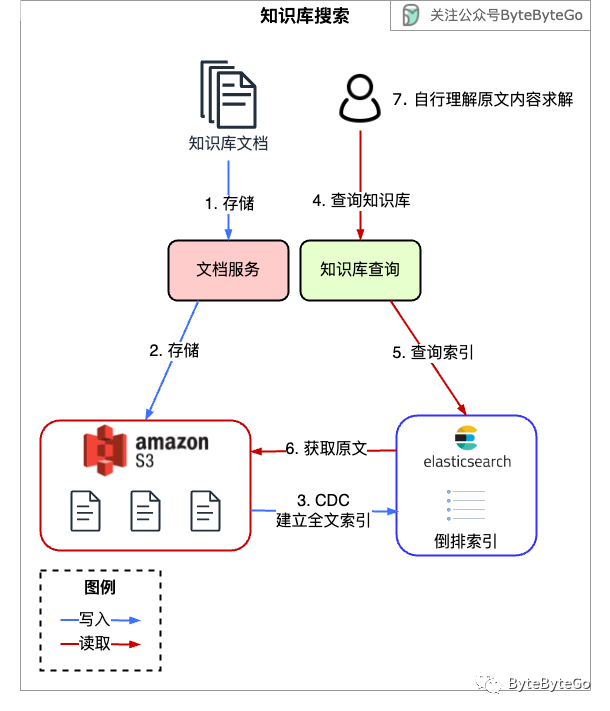 假设我们有很多知识库文档,传统的做法是使用对象存储(Amazon S3)和全文搜索引擎(ElasticSearch)来搭建一个搜索应用。