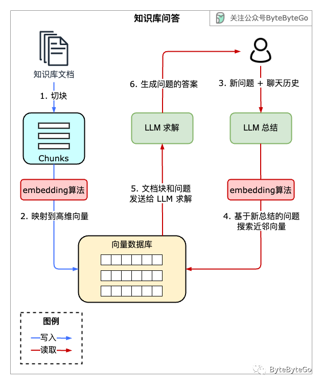 用户在使用知识库问答时,会输入一系列问题。前续问题被称为“上下文”,和新问的问题一起输入大语言模型。大语言模型将其总结后会生成一个新的问题。然后应用程序会在向量数据库里寻找这个新问题的近邻。这样我们就找到了最接近用户问题的文档块。