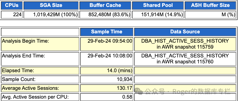 从ASH数据来看,这个库配置是十分的强悍,单节点224 core,物理内存应该在1.5TB左右,毕竟Oracle SGA 都分配了1TB(这是我见过最大的,之前见过SGA设置800GB的,这次刷新我的认知了,格局被拉满了)。