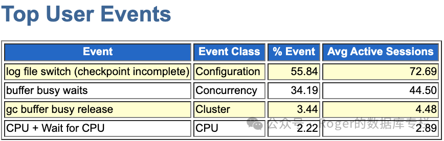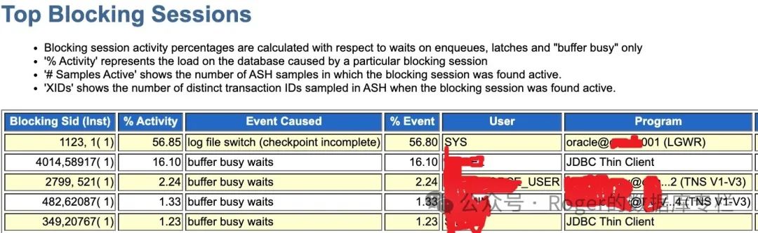 看到ASH event,似乎数据库日志切换相关操作出现了异常,对于buffer busy waits这通常是并发争用过高(比如热块)、IO问题等所导致。进一步来看看top process情况: