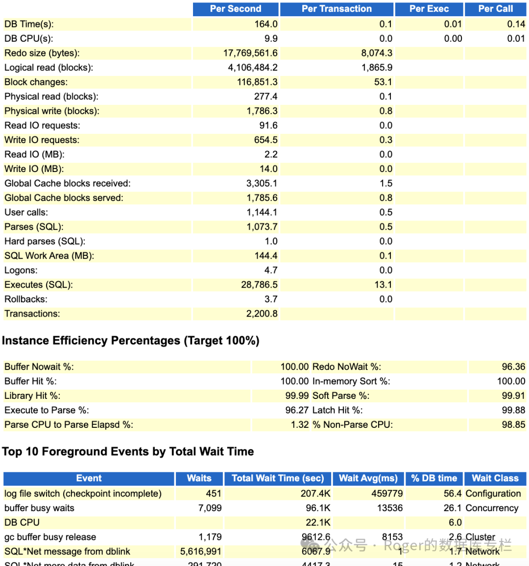 Oracle AWR的 event就不说了,跟ash 如出一辙,从load profile来看,这个系统压力还是很大的,每秒executes(SQL) 2万+。继续来看看Redo相关统计信息和lgwr进程的写情况: