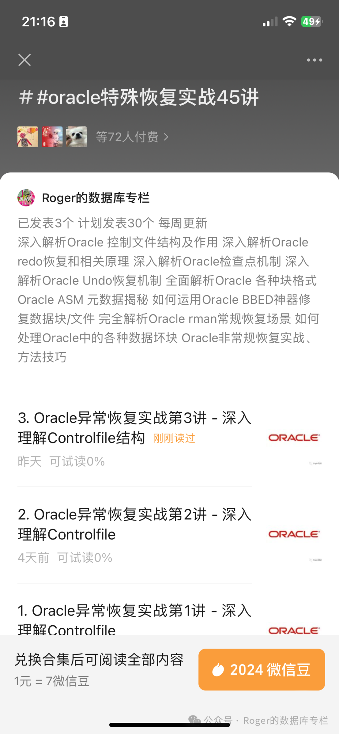 写在最后如果对数据恢复感兴趣的小伙伴,可以订阅如下课程,当然该课程并不仅仅是分享数据库异常恢复思路,更多的是讲解数据文件结构、块结构,redo、undo等相关原理,非常有助于大家加深理解,对于转战国产数据库,我认为也有一定借鉴意义。订阅的小伙伴,记得加我微信(最好是备注一下 已订阅xxx),我拉大家进小群,偶尔解答以及开开小灶,分享技术知识,不限于Oracle、Oceanbase、达梦数据库、openGauss等。