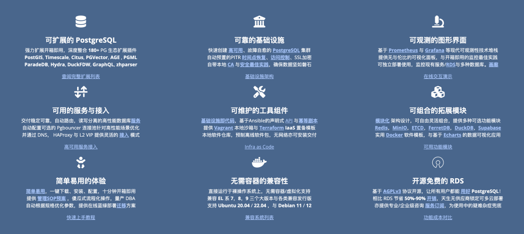 这张图列出了 PostgreSQL 要解决的六个核心问题:Postgres 的可扩展性,基础设施的可靠性,图形化的可观测性,服务的可用性,工具的可维护性,以及扩展模块和三方组件可组合性。