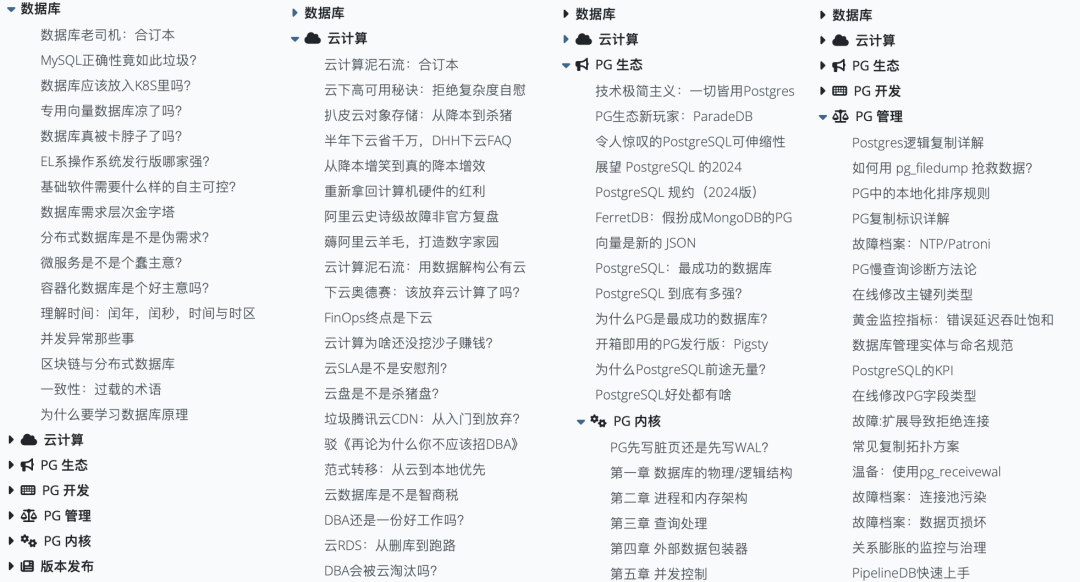 除了文档外,我们也整理了一下最近的文章纳入 Pigsty 博客。重新划分为六个专栏:云计算泥石流,数据库老司机,以及 PostgreSQL 的生态、开发、管理、内核四个板块。