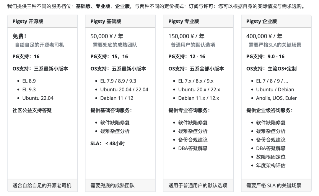 最后,我们还正式推出了明码标价的 Pigsty 专业版与服务订阅,为那些需要更强支持力度的用户提供进阶功能与兜底选项。