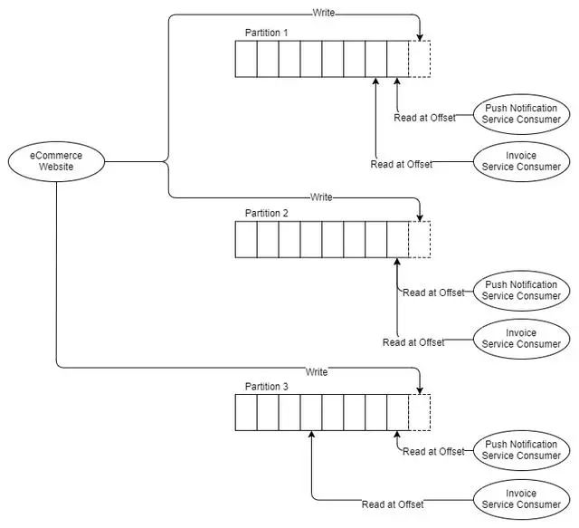 从图中可以看出,两个独立的消费者都使用相同的分区,但他们正在从不同的偏移中读取。也许发票服务处理消息所需的时间比推送通知服务要长,或者发票服务可能会停机一段时间并且赶上,或者可能存在错误并且其偏移量必须移回几个小时。