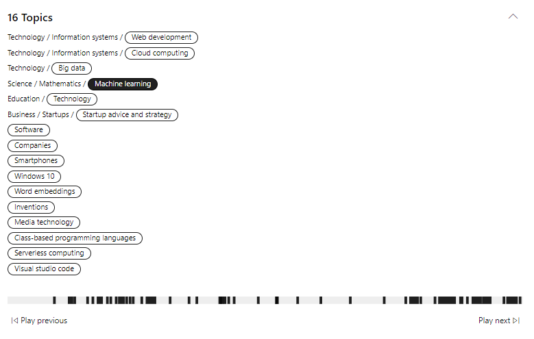 Azure视频索引器原有的关键字提取模型对转录抄本和通过OCR识别出的重要词汇进行标记。关键字提取模型和主题推断模型之间的主要区别在于,关键字是视频中明确提及的字眼,而主题则是推断出来的——例如,利用知识图谱将检测到的相似概念聚类在一起,以推断更高层级的隐含概念。