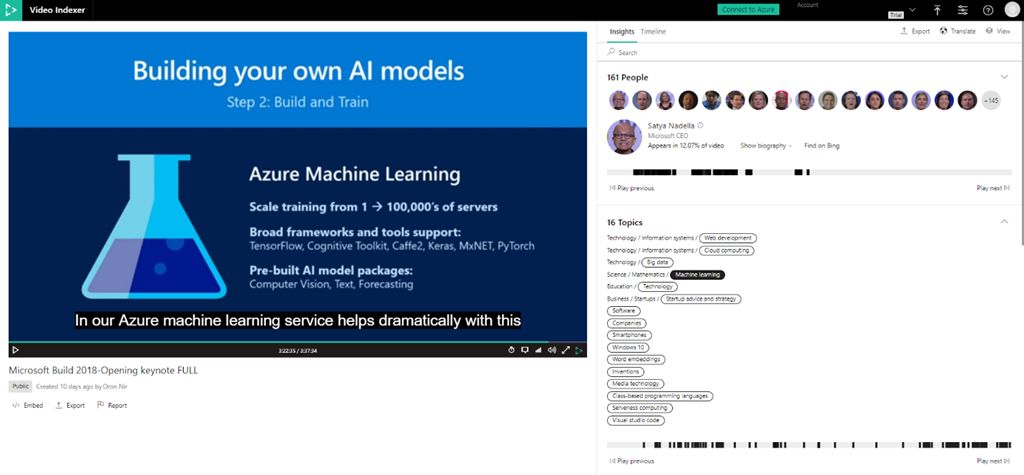 我们以微软Build 2018开发者大会的开场主题演讲为例。在演讲中,微软介绍了许多产品、功能、以及对短期未来的愿景,演讲的主题是如何将AI和机器学习融入云端和边缘设备。整个视频的长度超过三个半小时,如果手动标记需要花费很长时间。但利用视频索引器可以快速地自动产生以下主题词:技术、Web开发、词嵌入、无服务器计算、启动建议和策略、机器学习、大数据、云计算、Visual Studio Code、软件、公司、智能手机、Windows 10、创新和媒体技术。
