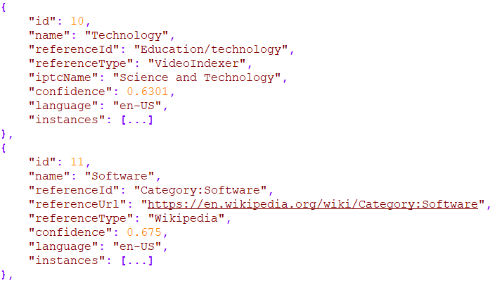 图3中,通过API获得的JSON格式数据所描述的“科学与技术”等IPTC主题词以及“软件”等维基百科类别主题词,在图2中视频索引器门户页面右侧的Insights标签页中展示。