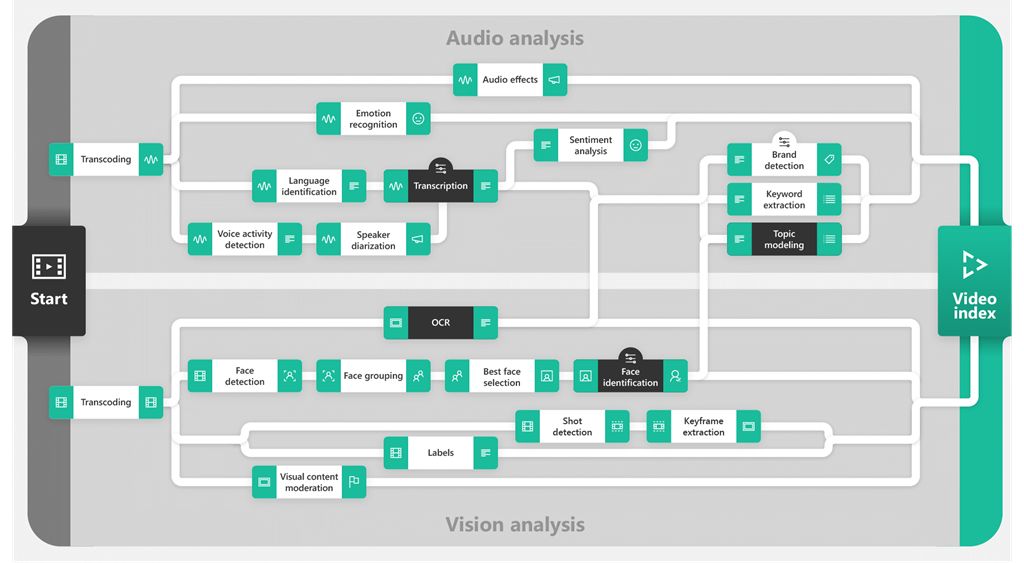 视频索引器内部所用的人工智能模型如图4所示。该图体现了对多媒体文件从上传(图片左侧)到得出洞见(图片最右侧)的整个分析过程。图表下方的视觉频道采用了多种计算机视觉算法、OCR和人脸识别技术。图表上方的音频频道以语言识别和语音-文本转换等基本算法为基础,兼有关键字提取和主题推断等自然语言处理的高级别模型。这张图清晰地展示了视频索引器如何以“搭积木”的方式对多个AI模型进行编排,并根据不同的独立输入信息来推断更高级别的概念。