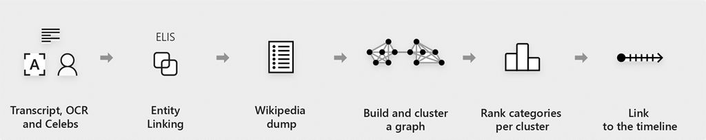 视频索引器利用两个模型来提取主题:第一是深度神经网络,它基于大型专有数据集,直接根据原始文本对主题进行评分和排序。该模型对视频索引器、IPTC和转录抄本进行映射;第二个模型将频谱图算法应用于视频中提及的实体。该算法所采用的输入信号,既包括从视频中识别出的知名人士的维基百科资料等结构化数据,也包括OCR和转录抄本等非结构化数据。