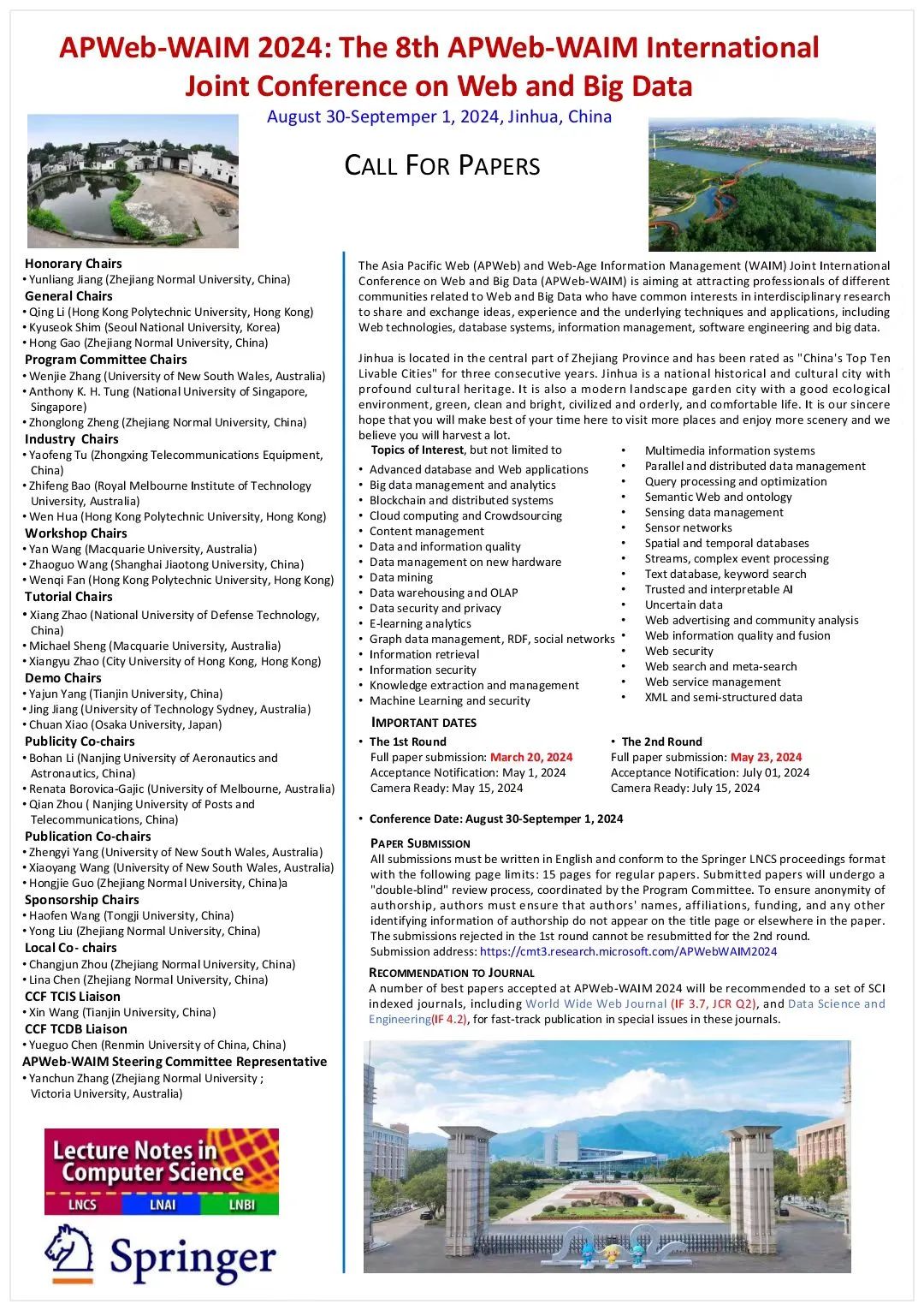 The 8th APWeb-WAIM 2024暨Web与大数据联合国际会议由浙江师范大学承办,将于2024年8月30-9月1日在浙江金华举行。