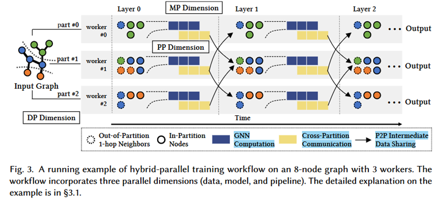 图神经网络(GNN)已经成为从图结构数据中捕获结构信息的强大工具,在推荐、知识图和搜索等领域有广泛的应用。这些领域中的图通常包含数亿个节点和数十亿条边。然而,现有的GNN系统可扩展性较差,这是因为GNN训练中的大量交叉计算依赖性,这导致当前并行化方法仍有不小开销。该文提出了G3,一个可以在十亿边图上大规模训练GNN的分布式系统。G3引入了GNN混合并行,该并行综合了三个维度的并行性,细粒度在worker之间共享中间结果,消除了先前工作中出现的全局集体通信或邻居复制的同步屏障。混合并行的例子如下图所示。