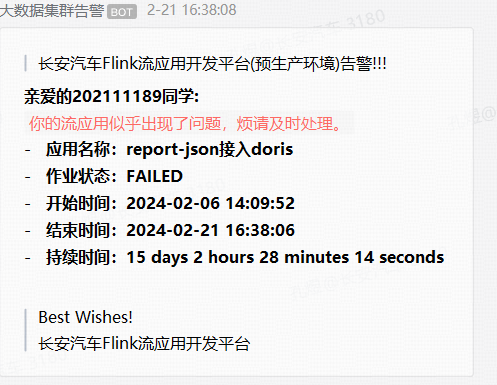 长安汽车针对 StreamPark 的一些特性进行了适应性改造,比如针对 StreamPark 的告警不仅支持邮件、飞书、钉钉和企业微信推送,还支持将告警信息按照重要程度进行分类,推送到不同的告警群与相关个人,方便相关运维人员及时捕捉重要告警信息,快速响应。