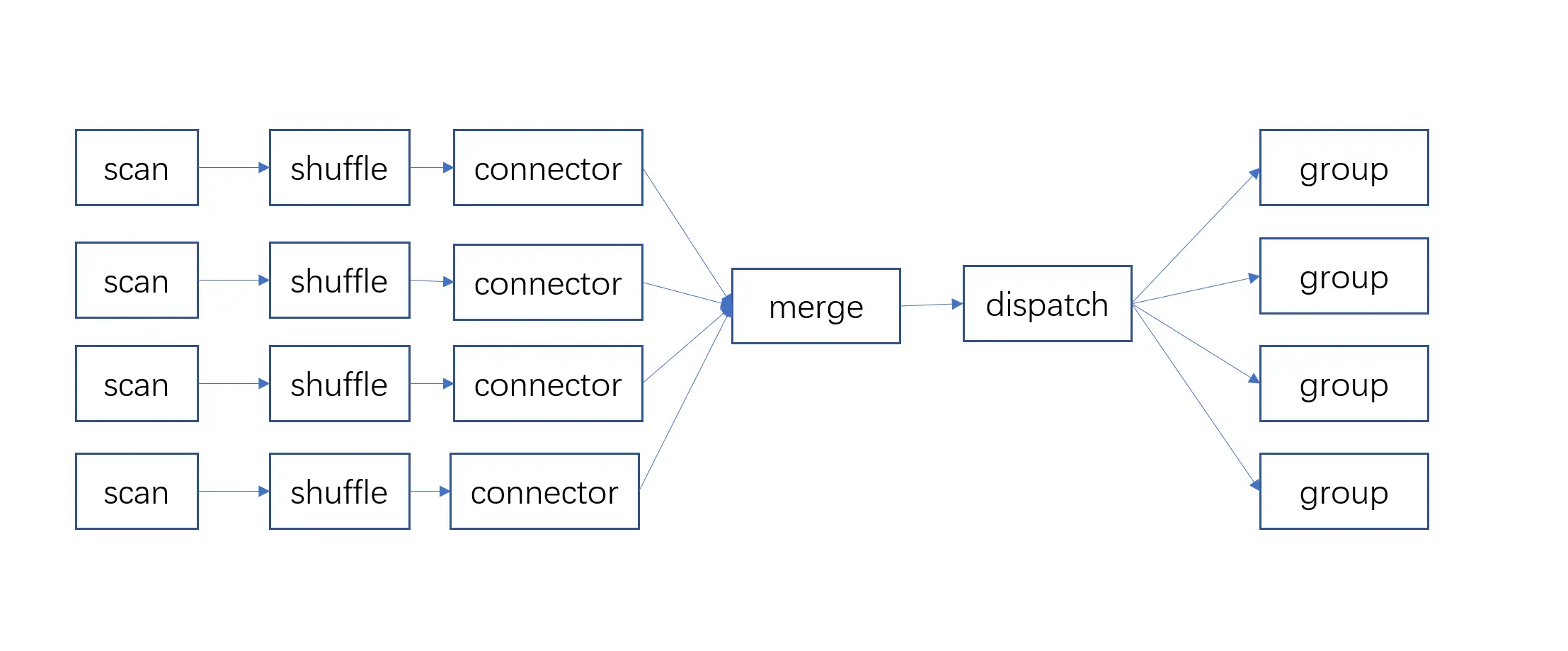 对group算子的shuffle,是将group算子在编译pipeline时静态展开成多个pipeline,对scan算子实际读取的block数据进行shuffle,理论上以每行数据为单位。每个pipeline接收shuffle输出的数据。此时group算子不需要merge group,每个单独的pipeline都可以直接输出数据到下一个pipeline。