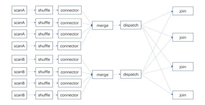 对join算子的shuffle,同样是将join算子在编译pipeline时静态展开成多个pipeline。join的输入分为probe和build两边,对两边的输入数据采用同样的shuffle算法,保证相同数据会分到同一个桶内。每个join算子也可以直接将join结果输出,而不需要做merge。