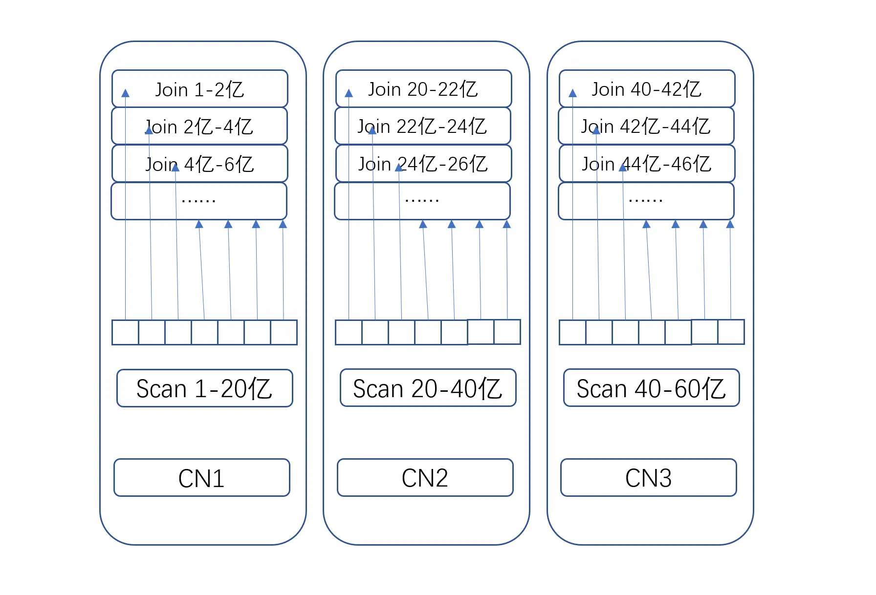 colocate shuffle join的具体原理是,从scan开始,利用block zonemap将数据分布到对应的CN上,并且尽可能保证后续的shuffle算法会将数据shuffle到当前CN上进行处理,最大程度减少数据跨网络发送。在这个例子中,优化器会告诉scan算子,block zonemap处于1-20亿之间的数据在CN1上读取,20亿-40亿之间的数据在CN2上读取,40亿到60亿之间的数据在CN3上读取。同时优化器会告诉shuffle join,1-20亿之间的数据需要shuffle到CN1上进行计算,20亿-40亿之间的数据shuffle到CN2上计算,40亿到60亿之间的数据在CN3上计算。如果每个CN有10核,那么具体到CN1是1-2亿之间在第一个pipeline上处理,2亿-4亿在第二个pipeline上处理,以此类推。具体到CN2是20亿-22亿之间在第一个pipeline上处理,22亿-24亿在第二个pipeline上处理,以此类推。具体到CN3是40亿-42亿之间在第一个pipeline上处理,42亿-44亿在第二个pipeline上处理,以此类推。