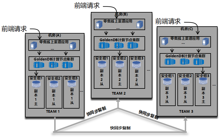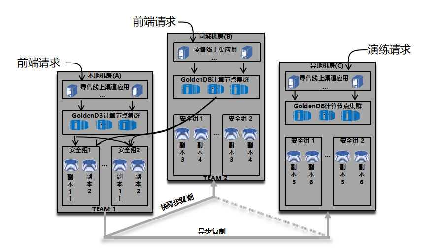 金篆GoldenDB支持两地三中心架构。金篆GoldenDB在本地数据中心和同城数据中心部署等量的计算节点集群和数据副本,异地机房再部署一组金篆GoldenDB副本。本地机房与异地机房之间采用异步复制方式,最大限度保证应用的可用性。