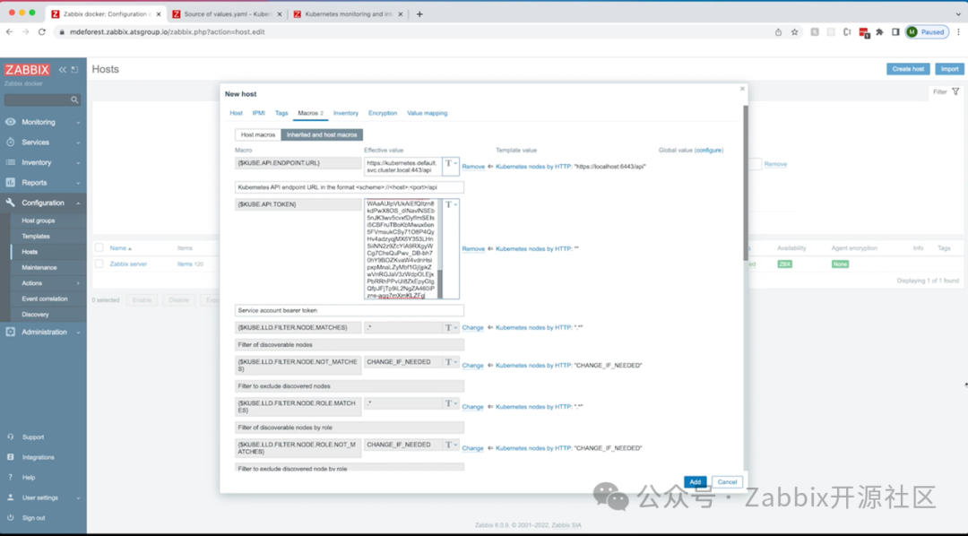 6. 单击Macros选项卡,并选择“Inherited and host macros”。您应该能够看到可能设置为影响集群中监控内容的所有宏。在这种情况下,我们需要更改前两个宏。第一个宏{KUBE.API.ENDPOINT.URL}应设置为Kubernetes API端点。在我们的环境中,设置为之前提到的内容:default.svc.cluster.local:443/api。接下来,令牌应设置为从命令行之前检索到的值。