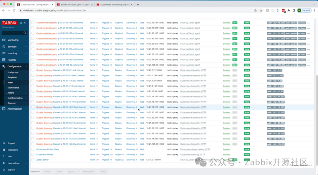 Zabbix采集Kubernetes API和kube-state-metrics公开的指标监控Kubernetes。Zabbix Helm Chart在集群中安装监控组件。Helm Chart包括以Daemonset方式运行的Zabbix Agent,用于监控每个节点上的本地资源和应用程序。还安装了一台Zabbix Proxy,用于采集监控数据并将其传输到外部的Zabbix Server。