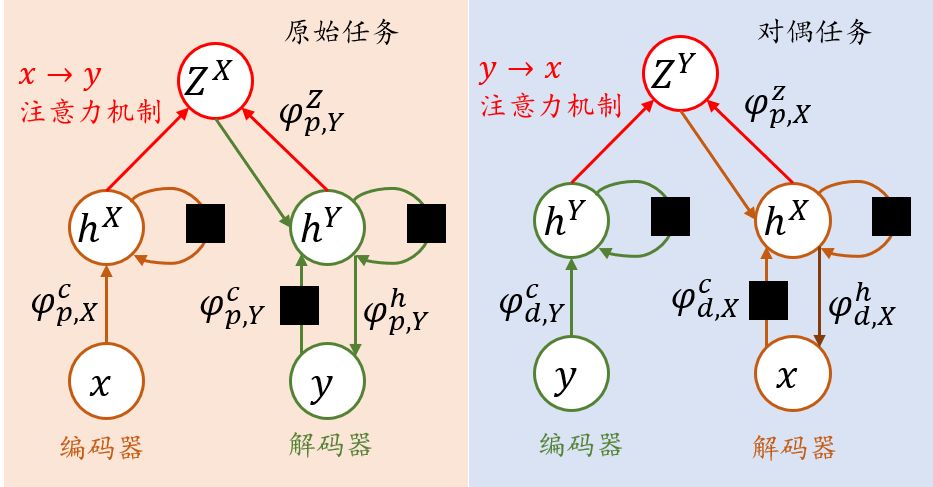 用于解码x,基于得到的文本信息ZY。也就是说,给定一对对偶任务,原始任务的编码器和对偶任务的解码器高度相关,因为它们都是为了处理同一种语言,只是依赖的条件不同。
