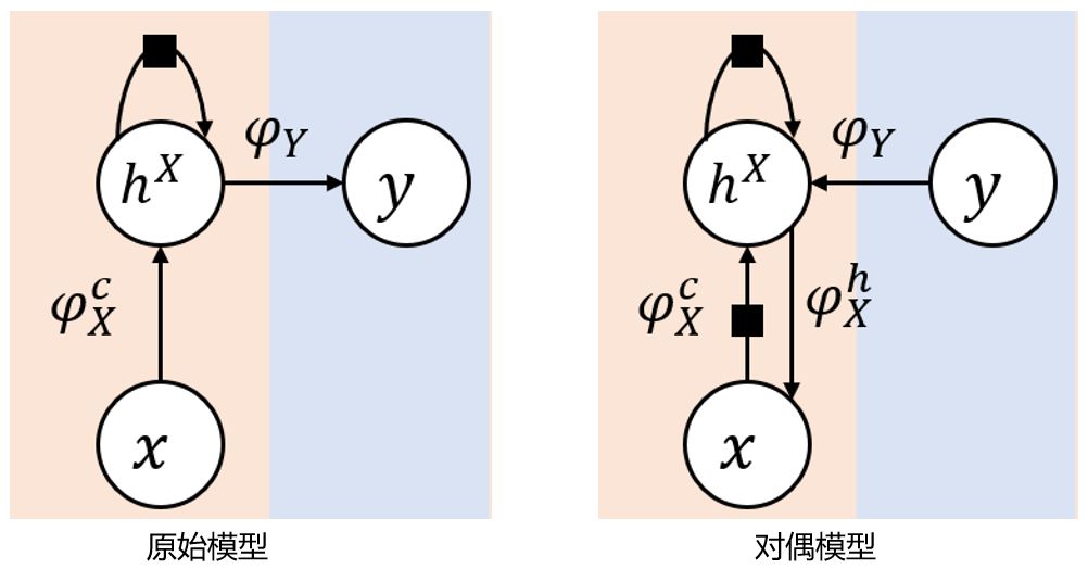 在非对称的场景中,x和y中的元素不对等,甚至语义空间也不同,因此,原始和对偶任务的模型也不尽相同。例如,在情感分类的任务中,x是自然语言的集合,而y是标签的集合,例如,y={0,1}。x和y的异质性使得我们要使用不同的模型结构。