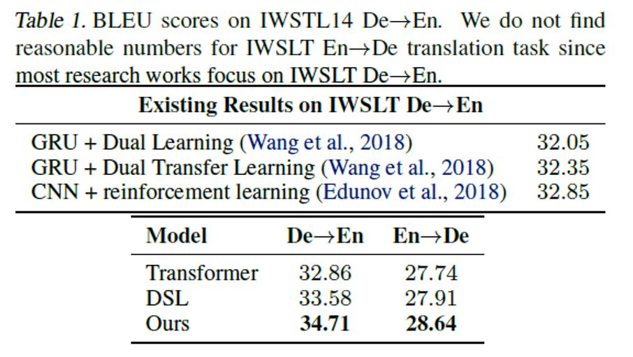 在IWSLT De↔En任务中,我们得到了德文到英文的最佳结果34.71。相比于基准算法Transformer,我们在原始任务德文到英文和对偶任务英文到德文上分别提高了1.85和0.90个点。相比于对偶有监督学习,我们的方法能够分别获得1.13和0.73个点的提升。