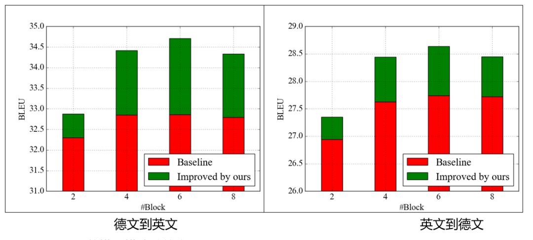 (2)当模型的模块数小于6的时候,在两个方向的翻译任务上,随着模块数的增加,模型层面的对偶学习提升的性能(图中绿色部分)会提升。这说明,虽然更深的模型有更强的表达力,但可能会受到过拟合的影响,特别是在数据量比较小的IWSLT数据集上。我们提出的方法能将对偶性引入模型中约束模型空间,并且能够更加充分地利用数据;