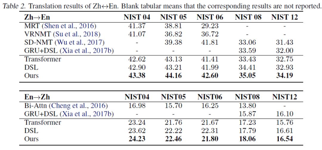 我们将所有的实验模型设置为6个模块。对于IWSLTDe↔En任务,我们选择transformer_small参数配置办法,其余两个任务选择的配置均为transformer_big。同时,我们使用对偶有监督学习作为对比算法。