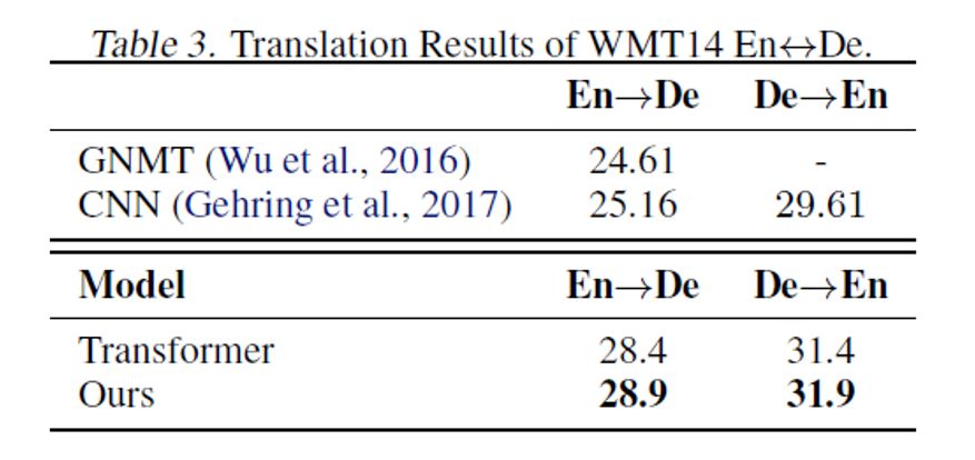 最后,在WMT英德互译的任务上,模型层面的对偶学习能够在Transformer的基础上将模型的性能进一步提升0.5个点。实验结果如下表: