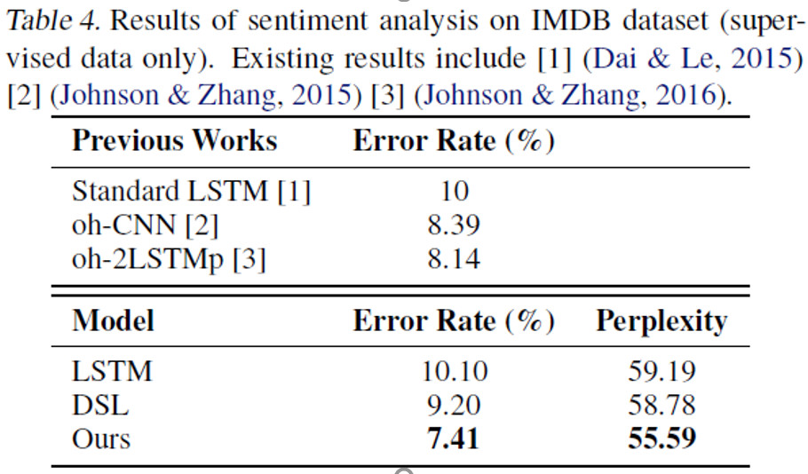 我们在IMDB数据集上进行了验证。我们选用标准的LSTM网络作为原始任务和对偶任务模型的基本单元。模型的单词嵌入和情感标签的嵌入表达均为500维,隐藏层节点数为1024,词表的大小是10k,Dropout的值设置为0.5。我们将softmax矩阵和单词嵌入矩阵(包括单词的和情感标签的)共享。实验结果如下表:
