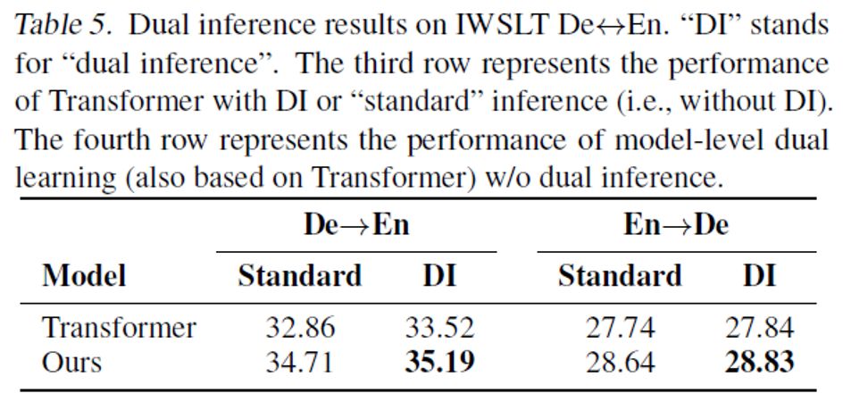 我们在IWSLT德英互译任务上验证了模型层面的对偶学习和对偶推断结合的性能,实验结果如下表: