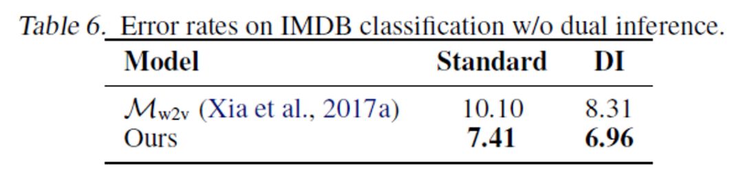 我们同样在情感分类任务中测试了模型层面对偶学习和对偶推断结合的性能。下表展示了对偶推断在IMDB数据集的分类错误率: