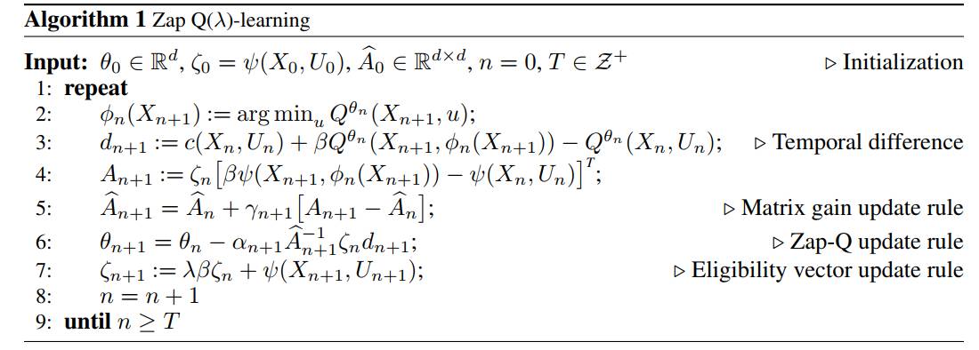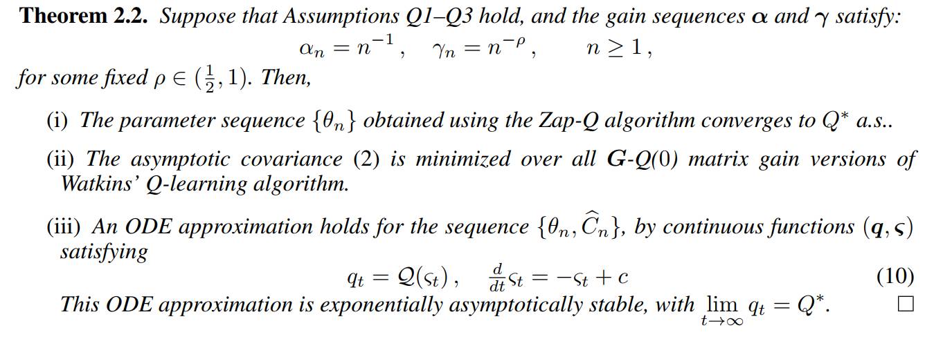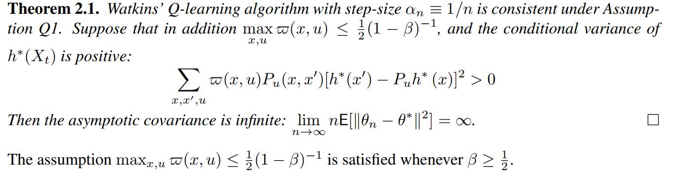 举几个例子来说,Zap Q-Learning通过分析Q-learning的方差,提出了名为zap Q-learning 的算法,使得新算法的渐进方差达到最优。具体来说,传统Q-learning算法的收敛慢、不稳定等问题一直困扰着大家。而这篇文章证明了一个定理:说明传统的Q-learning算法在一些假设下,渐进方差会趋于无穷,从而解释了Q-learning算法不稳定、难收敛的原因。进一步,作者根据matrix gain技术,提出了Zap Q-learning算法,使得新算法的方差达到最小,并且证明了算法的收敛性。