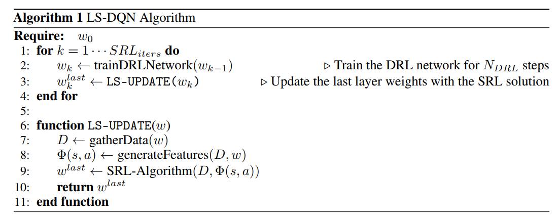 在Shallow Updates for Deep Reinforcement Learning中,作者将linear RL 和deep RL 结合起来,取长补短。具体来说,深度强化学习(DRL),例如DQN等方法,在最近一段时间取得了非常多的前沿的成就,但是有非常多的非常敏感的超参需要手动去调整。对于浅层强化学习来说,例如线性函数近似的方法,算法更加稳定,并且没有那么多的超参数需要去调整,但是往往需要精心设计过的特征提取。在这个工作中,作者提出了LS-DQN 的算法,结合了深度强化学习算法中的特征提取和浅层强化学习算法。具体做法是先训练深度强化学习网络,然后将神经网络的最后一层看成是浅层线性模型,将最后一层的参数利用传统浅层强化学习算法进行重新调整。最后作者在5个Atari游戏上做了实验,实验结果也是表现出来这一简单的idea非常的有效。