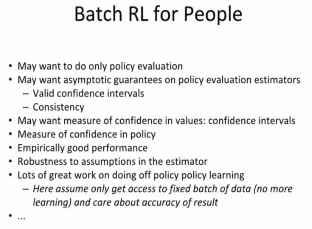 在介绍强化学习帮助人的环节,tutorial 主要集中在如何高效准确鲁棒地做policy evaluation的问题, 特别介绍了很对在off-policy setting下的batch RL算法的分析和改进。