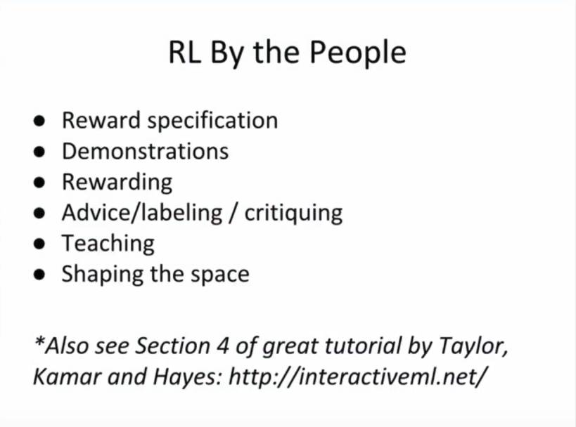 在介绍人帮助强化学习的环节,tutorial主要从人在强化学习算法学习过程中所起的作用的角度,介绍了相关的工作。例如如何设计reward,如何给RL agent 做演示从而进行模仿学习,如何让人帮助RL agent 做好Exploration-Exploitation trade-off等等。