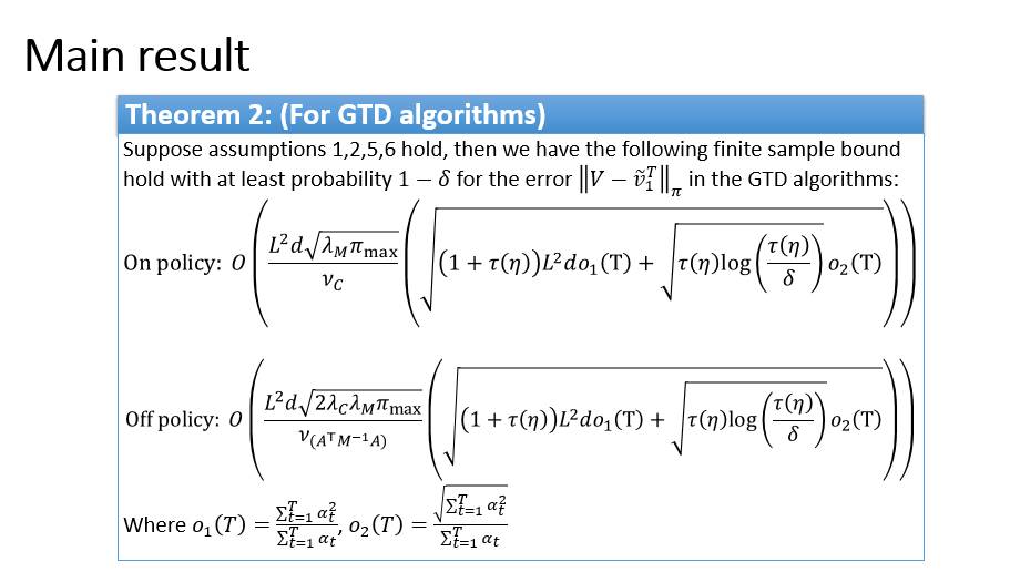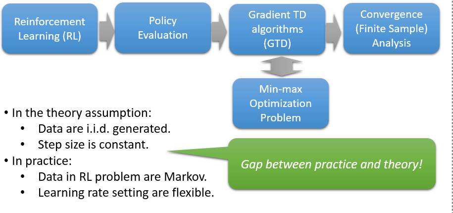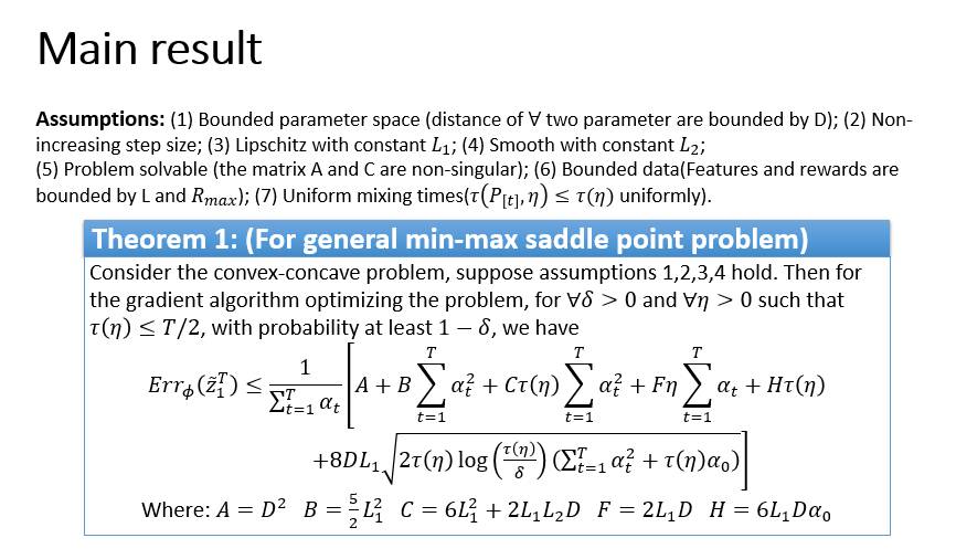 这是一篇强化学习方面的理论性论文,解决的是在 强化学习中一个重要问题——策略评估 (Policy Evaluation)在更贴近实际的假定下的收敛性分析。策略评估的目标是估计给定策略的价 值函数(从任一状态出发,依照给定的策略时,期望意义下未来的累计回报)。 当状态空间特别 大或者是连续空间的时候,线性函数近似下的 GTD 策略评估算法非常常用。考虑到收集数据的过 程非常耗费时间和代价,清楚地的理解 GTD算法在有限样本情况下的表现就显得非常重要。之前 的工作将 GTD 算法与鞍点问题建立了联系,并且在样本独立同分布和步长为定值的情况下给出了 GTD 算法的有限样本误差分析。但是,我们都知道,在实际的强化学习问题中,数据都是由马氏 决策过程产生的,并不是独立同分布的。并且在实际中,步长往往也不一定是一个定值。因此在我 们的工作中,我们首先证明了在数据来自于马尔科夫链的情况下,鞍点问题的期望意义下和高概率 意义下的有限样本误差,进而得到了更接近于实际情形下的 GTD 的算法的有限样本误差分析。