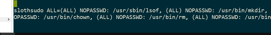 (1)该模式需要提前配置好sudo用户,通过visudo命令对sudo用户权限进行配置,如下配置可以限制slothsudo用户仅对某些命令进行sudo操作, 使用sudo用户进行安装时需要配置的命令有lsof、mkdir、su、chmod、chown、rm、sh、ls、find、cp。