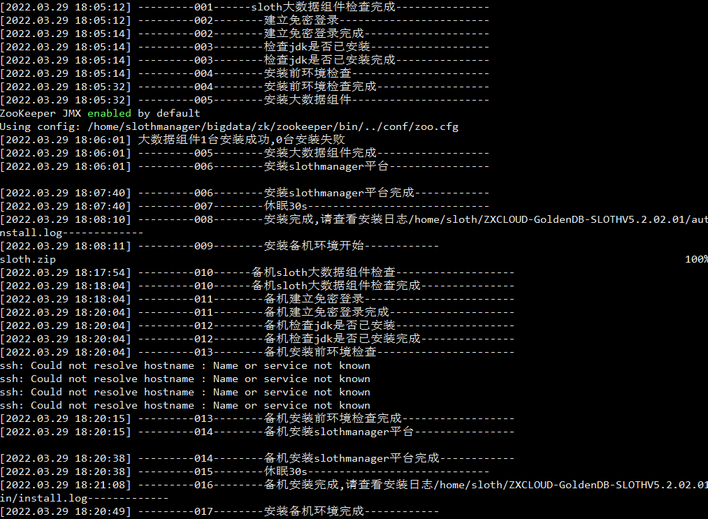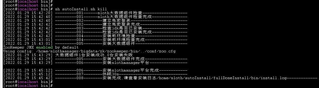 本脚本安装模式为全新安装,包括建立免密SSH(因为需要远程启动大数据组件)、环境检查(例如各端口占用)、jdk检查及安装 以及大数据组件(zk、kafka)、mysql、slothmanager server的安装。
