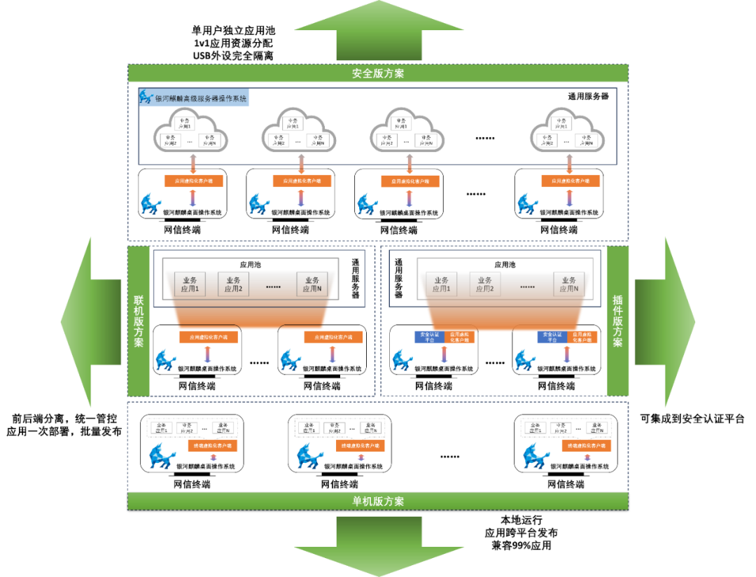 通过提供中间件部署方案,成功地将银河麒麟应用虚拟化产品集成到用户安全认证平台 ,实现了用户业务的“无感”迁移;