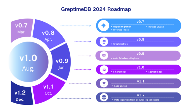 GreptimeDB 2024 年的重大版本迭代路线,GreptimeDB v1.0 将标志着我们向生产就绪版本迈出重要一步,搭载智能索引等进阶功能,重新定义效率与性能的新高标。