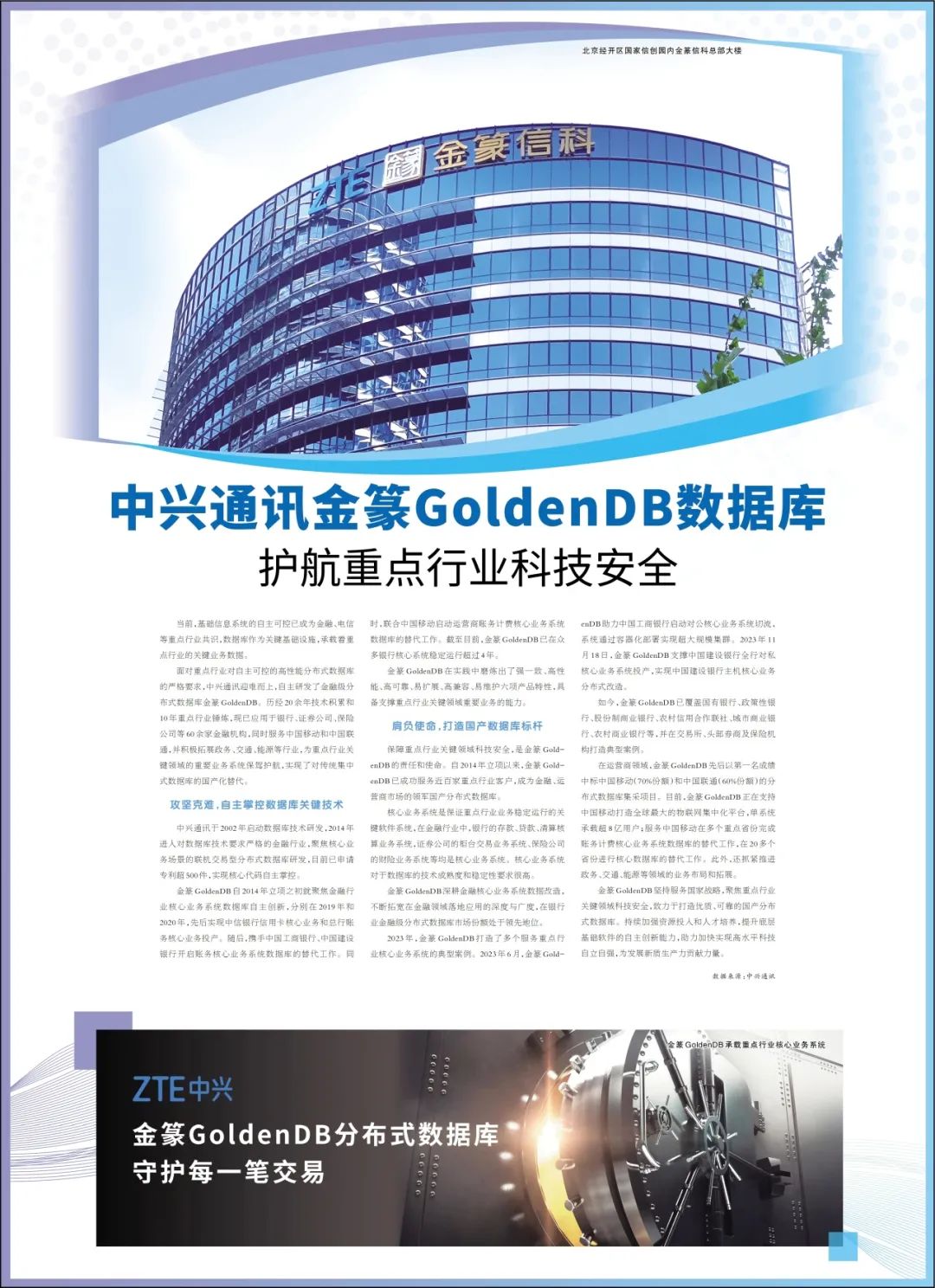 2024年3月5日,《人民日报》整版刊发《中兴通讯金篆GoldenDB数据库,护航重点行业科技安全》。文章指出:金篆GoldenDB依托于中兴通讯20余年研发积累和10年重点行业锤炼,已成为金融、运营商市场领军的国产分布式数据库,现已应用于银行、证券、保险等60余家金融机构,同时服务中国移动和中国联通,并积极拓展政务、交通、能源等行业,为重点行业关键领域的重要业务系统保驾护航!具体报道如下:
