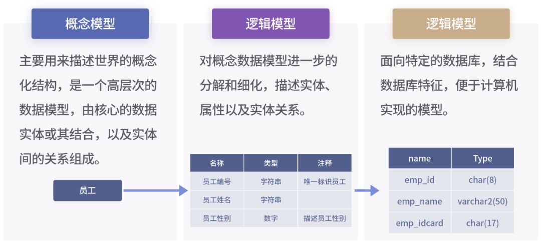 数据的关系错综复杂,成千上万个表通过各种关系或约束互联形成复杂的结构。没有数据模型很难看到现有数据库的结构、理解关键的概念。数据模型由三层构成,概念模型/逻辑模型/物理模型: